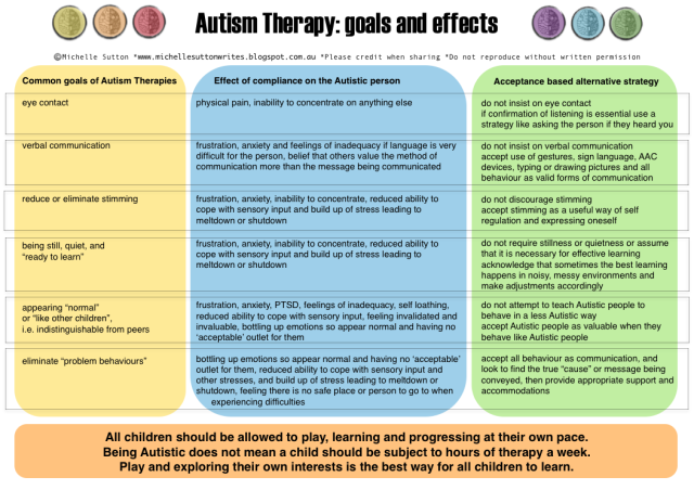 The image contains 3 coloured boxes set out as three columns. The box on the left is yellow and is titled “Common goals of Autism Therapies“. The box in the middle is blue and is titles “Effect of compliance on the Autistic person“. The box on the right is green and is titled “Acceptance based alternative strategy“.