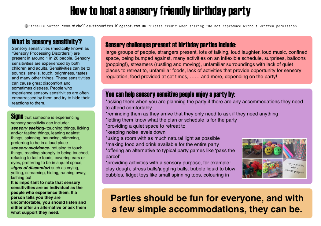 Birthday parties can be really overwhelming for people who experience sensory sensitivities. Half my family, myself included, find parties and large group gatherings difficult in various ways. This graphic contains information about sensory sensitivities, and what you can do to support people who experience them when they attend your party.
